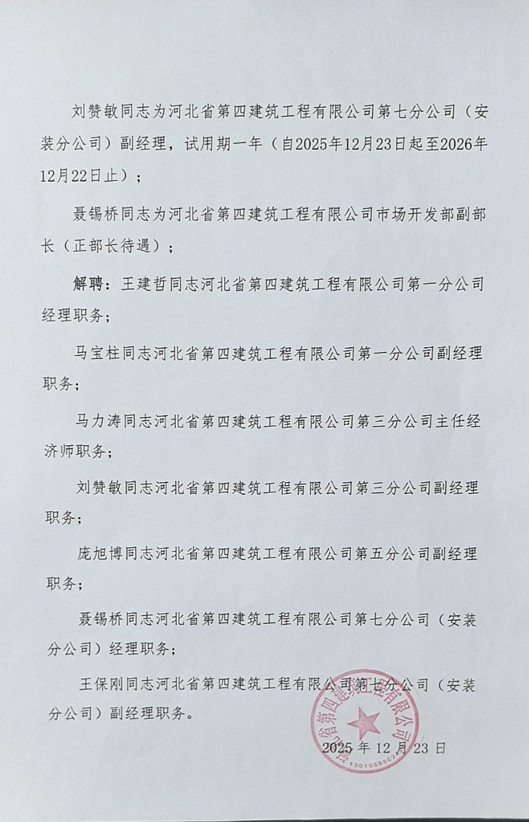河北四建:关于王建哲等同志聘解职务的通知